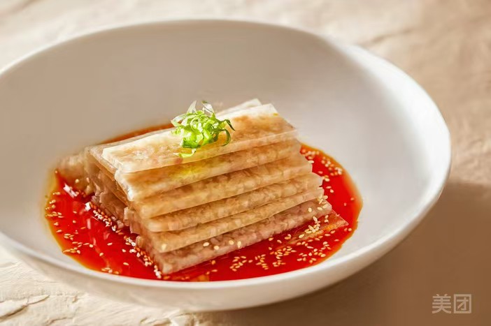 备受瞩目的捞汁五福莜面,堪称晋味养生代表。莜面手工轧制后劲道弹牙,搭配黄瓜丝、胡萝卜丝、紫生菜、心灵美、黄豆嘴“五福配菜”,浇上鲜醇捞汁并撒上现磨芝麻盐,清爽解腻又寓意吉祥,是山西人餐桌上的经典风味。自制皮冻则延续传统工艺,精选猪皮反复刮净油脂、焯水去杂,慢火熬煮后冷藏成型,质地Q弹透亮,蘸上蒜泥醋汁,口感爽滑不腻,尽显家常本味 。