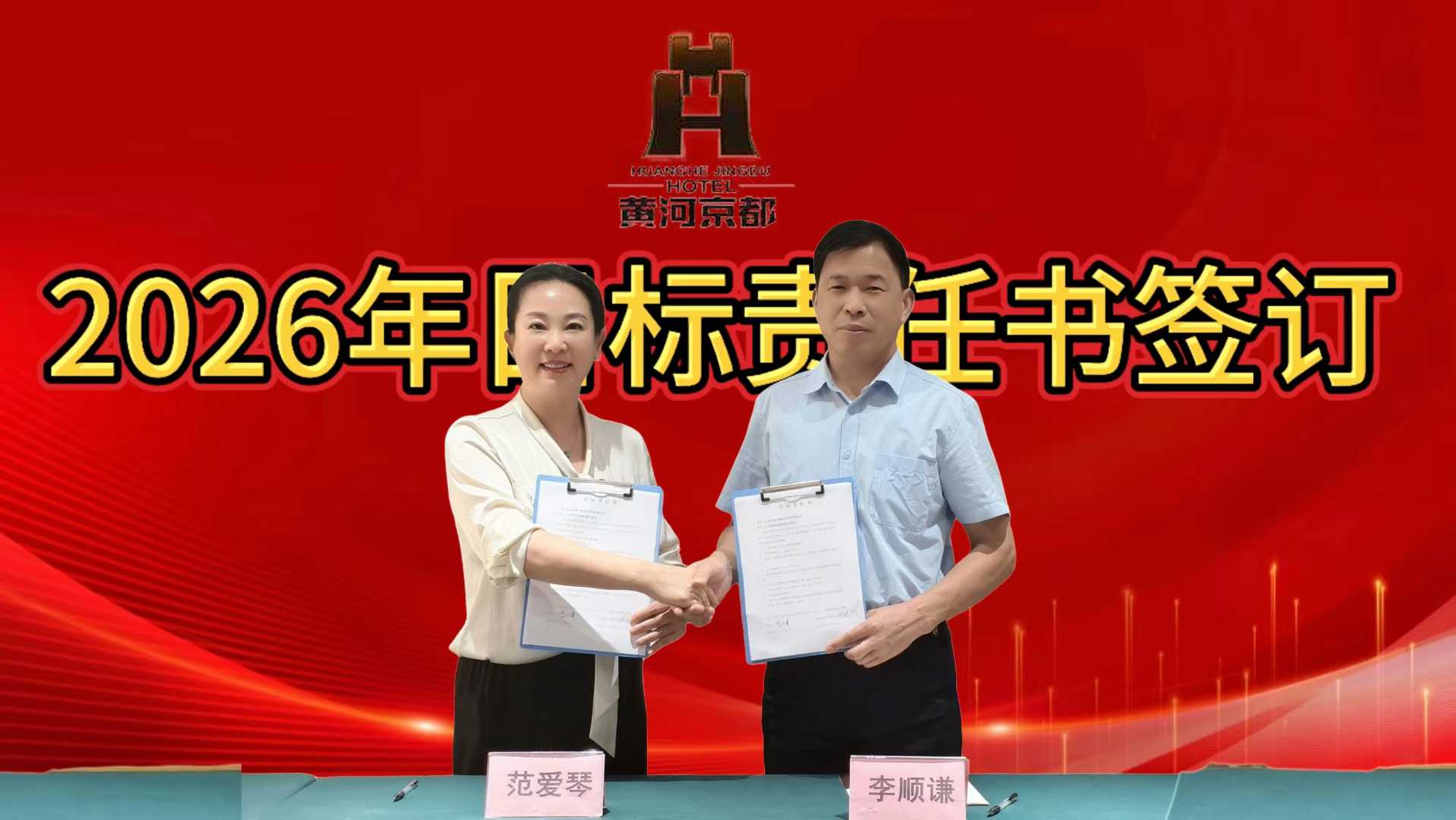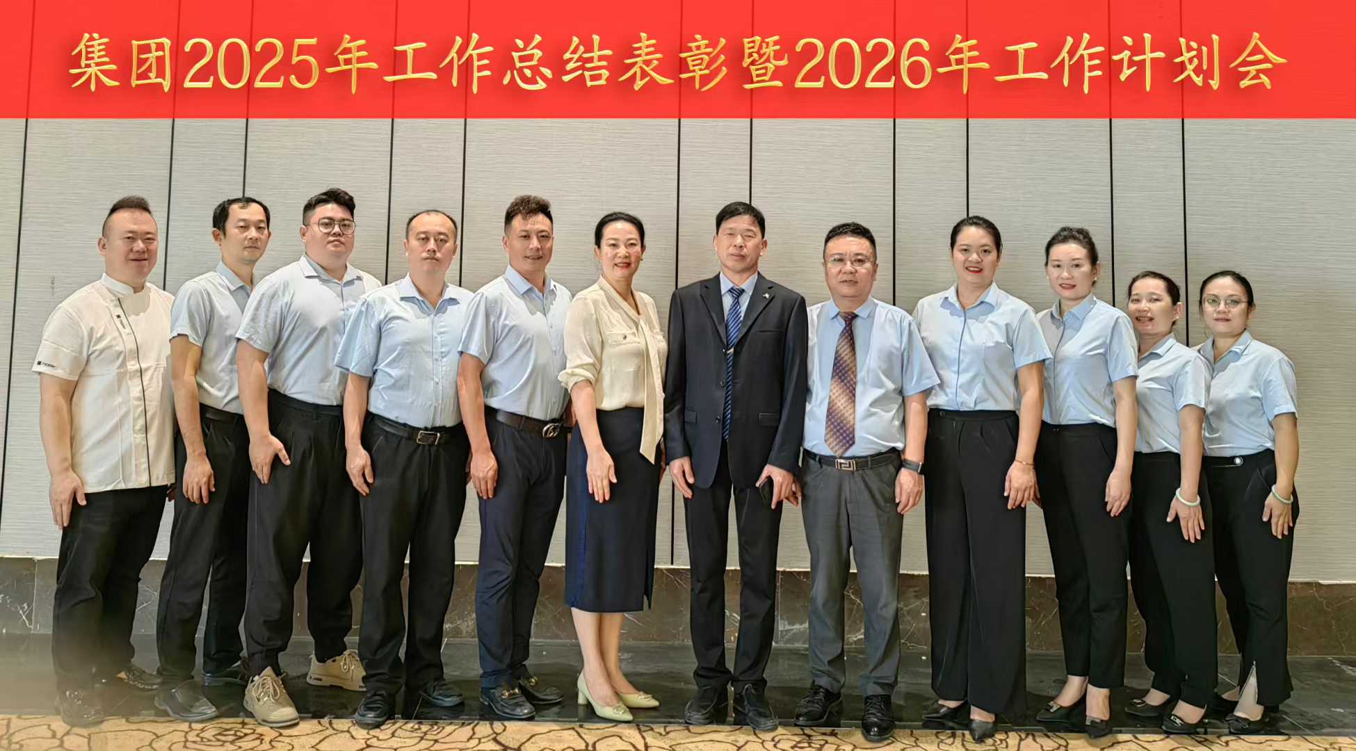 集团执行董事/总裁屈文玉先生在会上对 2026 年度工作作出全面安排,围绕经营指标、服务升级、品牌拓展、团队建设等核心维度提出具体要求,为集团新一年的发展指明方向。会议还举行了 2026 年目标责任书和安全责任书签订仪式,各酒店与集团签订责任书,将责任层层落实,为年度目标的达成筑牢根基。最后,各会场参会人员合影留念,定格下这一凝心聚力的时刻。